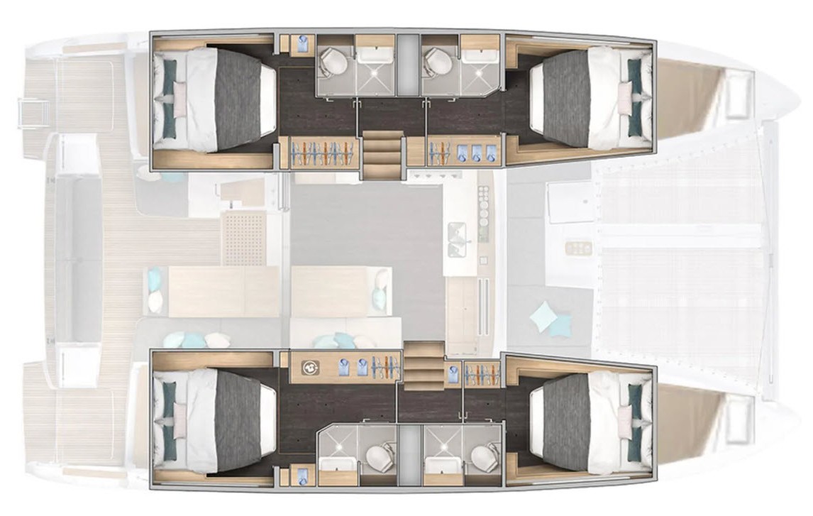 Our typical catamarans have 4 double cabins, each with its own en-suite bathroom, comfortably accommodating up to 8 guests.